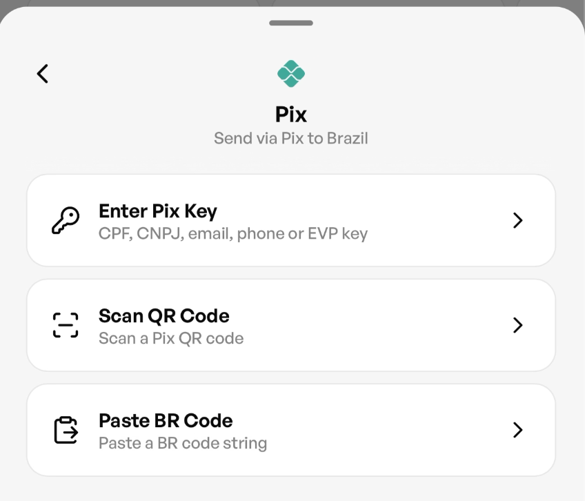 From there, you can choose any of the three standard PIX formats. You can enter a PIX key such as a phone number or email, scan a QR code displayed by a merchant, or paste a BR code from an invoice or payment request.